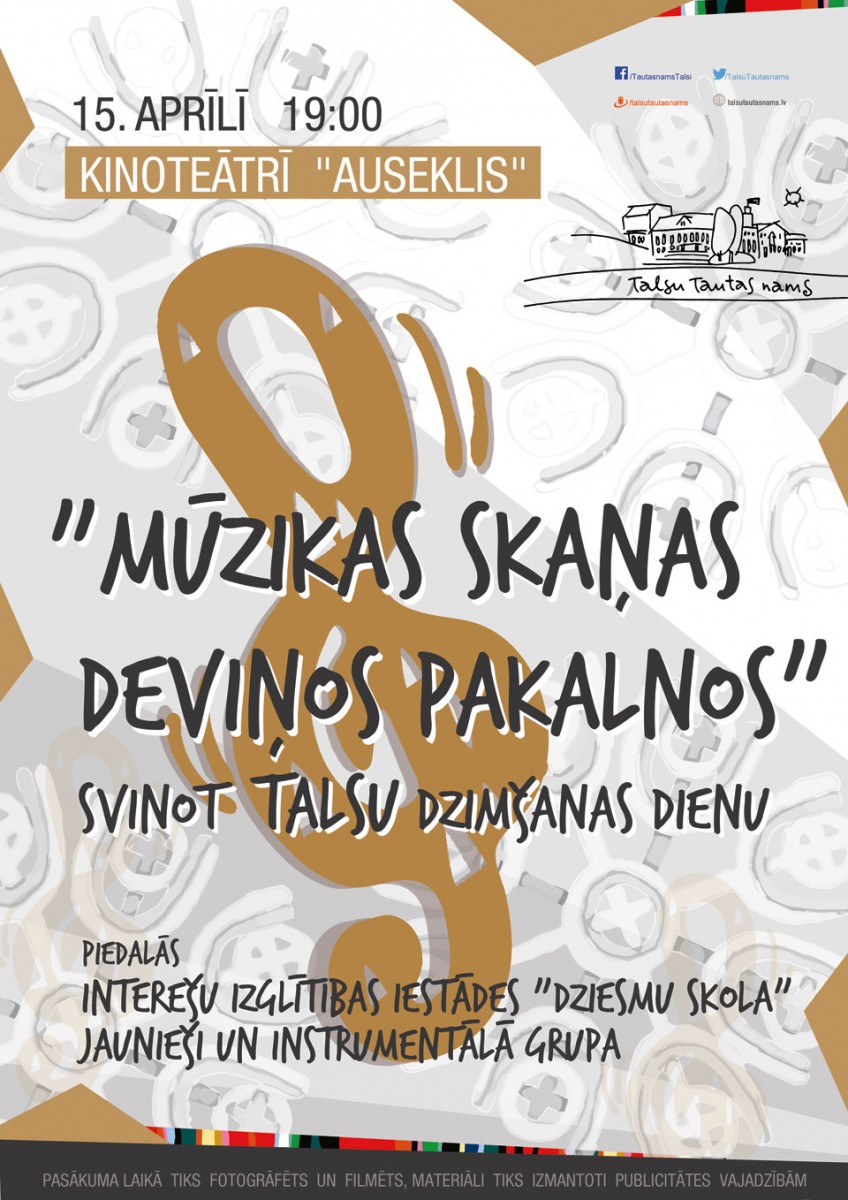 Kinoteātrī “Auseklis” plkst. 19:00 aicinām baudīt koncertuzvedumu “Mūzikas skaņas deviņos pakalnos”. Interešu izglītības iestādes „Dziesmu skola” jaunieši un instrumentālā grupa rādīs emocionāli skaistas un saviļņojošas „Mūzikas skaņas”, kuras ar video palīdzību tiks izdziedātas Talsu deviņos pakalnos. Jaunieši izdziedās prieku, draudzību, laimi, skumjas, mīlestību, vedot klausītājus krāšņā mūzikas pasaulē.