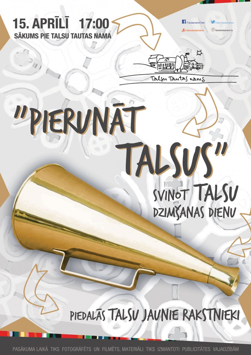 Plkst. 17:00 no Talsu Tautas nama, dosimies kopīgā pastaigā pa Talsu pilsētu, pierunājot Talsu pilsētas ielas ar dzeju, skaistiem vārdiem un vēlējumiem mūsu pilsētai. Pasākumā “Pierunāt Talsus” dzirdēsim Talsu 2.vidusskolas jauno autoru studijas dalībnieku un Talsu Kristīgās vidusskolas skolēnu jaunrades darbus, kā arī radošos Talsu Valsts ģimnāzijas Latviskās jaunrades kluba “Savējie” jauniešus.