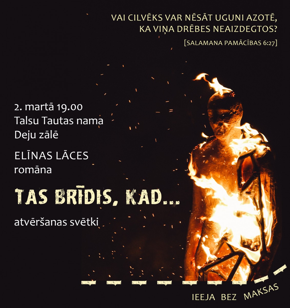 Arhīvs 2.martā plkst. 19:00 Talsu Tautas nama Deju zālē Elīnas Lāces romāna “Tas brīdis, kad” atvēršanas svētki 11.12.2018.04.03.2019.