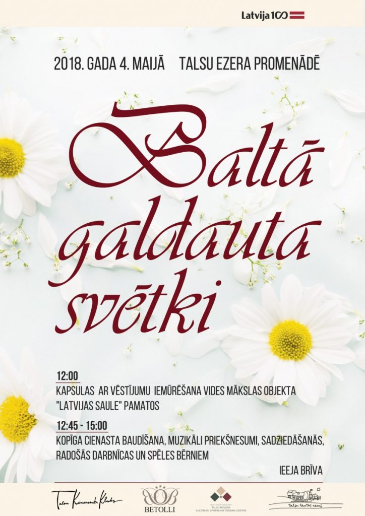 4.maijā, Latvijas Republikas Neatkarības deklarācijas pasludināšanas dienā, Talsu ezera promenādē no 12.00 līdz 15.00 kopā svinēsim Baltā galdauta svētkus! To laikā vienkopus pie balti klāta svētku galda aicinām pulcēties kaimiņus, ģimenes, kolēģus un draugus, lai veidotu ciešāku piederību savai pilsētai, novadam un valstij, būtu kopā un radītu svētku izjūtu sevī un citos. 4. maija svinības Talsos atklāsim ar simbolisku notikumu – tēlnieka Ojāra Arvīda Feldberga veidotā vides mākslas objekta „Latvijas saule” kapsulas iemūrēšanu.