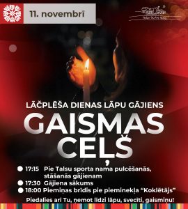 Aicinām ikvienu ar svecīti, lāpu, gaismiņu piedalīties Lāčplēša dienai veltītā gājienā “Gaismas ceļš”, lai godinātu un pieminētu mūsu varoņus, kuri cīnījās par Latvijas brīvību un neatkarību!
