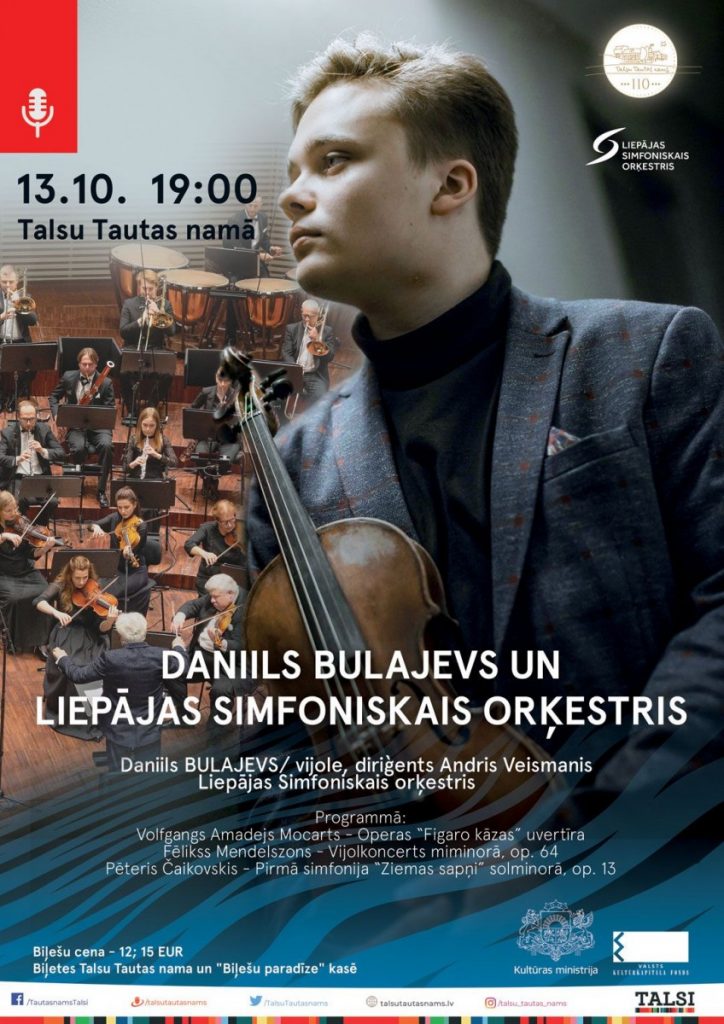 13. oktobrī plkst.19.00 Talsu Tautas namā Liepājas Simfoniskais orķestris, vijolnieks Daniils Bulajevs un diriģents Andris Veismanis