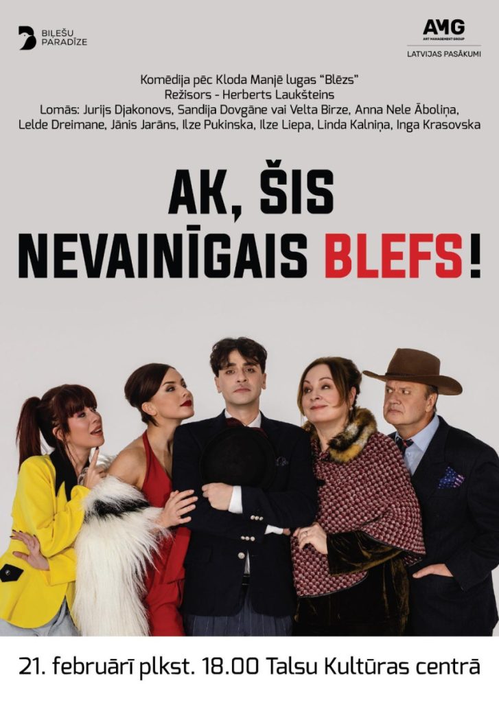 21.februarī, plkst.18:00 Talsu Kultūras centrā būs skatāma komēdija “Ak, šis nevainīgais blefs!” (pēc Kloda Manjē lugas “Blēzs”)