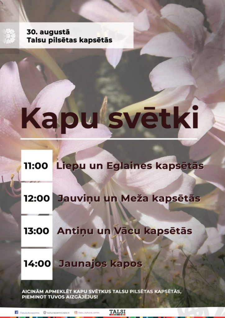 Aktualitātes Jaunumi 30.augustā norisināsies Kapu svētki Talsu pilsētas kapsētās 25.08.2025.26.08.2025. 30. augustā norisināsies Kapu svētki Talsu pilsētas kapsētās. Aicinām apmeklēt Kapu svētkus, pieminot tuvos aizgājējus!