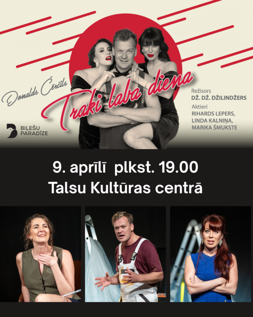 9.aprīlī, plkst.19:00 Talsu Kultūras centrā viesosies režisora Dž. Dž. Džilindžera jaunākais iestudējums – britu dramaturga Donalda Čērčila komēdija “Traki laba diena”. Asprātīga un izsmalcināta humora luga, kas pirmo reizi tiek iestudēta Latvijā.