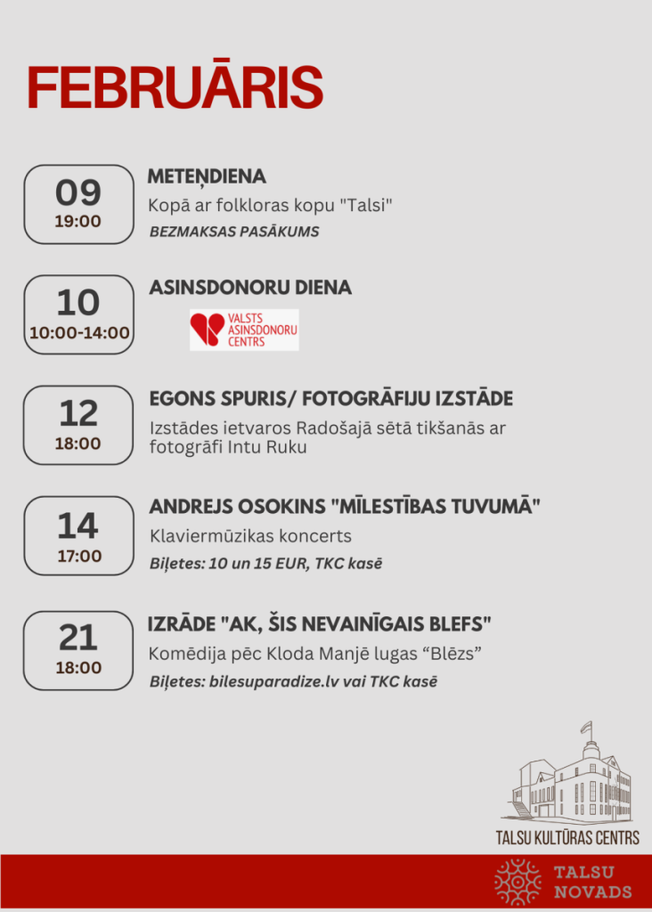 Ielūkojies februāra norisēs Talsu Kultūras centrā!