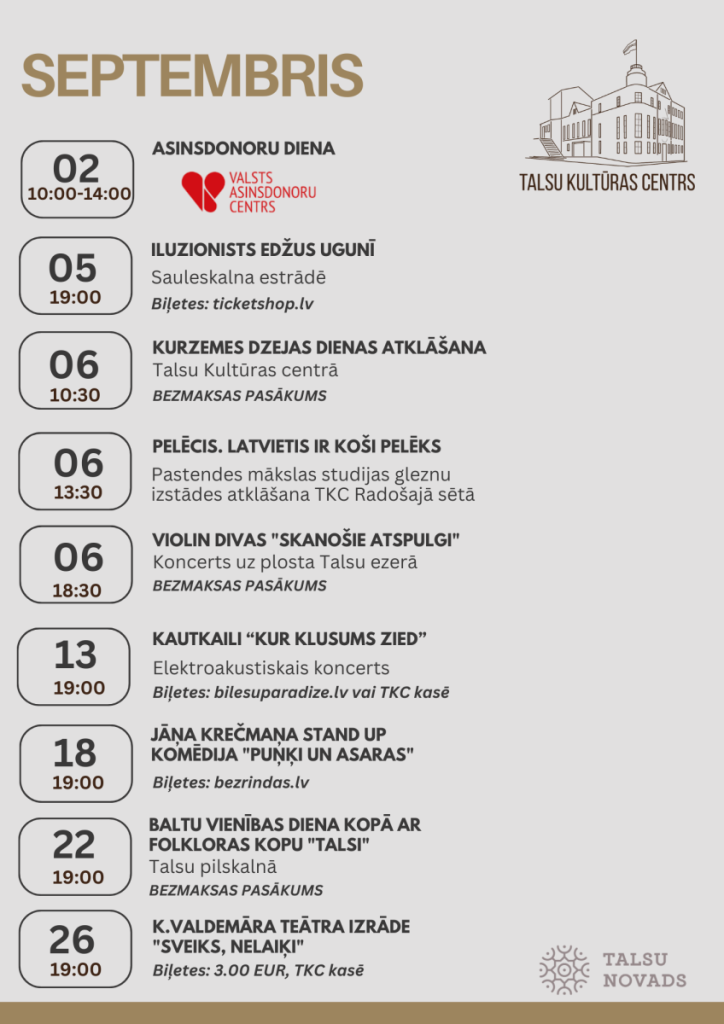 Aktualitātes Jaunumi Pasākumi Iepazīsties ar septembra aktualitātēm un pasākumiem Talsos un Talsu Kultūras centrā! 26.08.2025.27.08.2025.