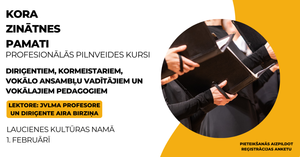 Aicinām piedalīties profesionālās pilnveides kursos “Kora zinātnes pamati”, kas paredzēti koru diriģentiem, kormeistariem, koru speciālistiem, vokālo ansambļu vadītājiem un vokālajiem pedagogiem. Kursu vadīs Jāzepa Vītola Latvijas Mūzikas akadēmijas profesore un diriģente Aira Birziņa.