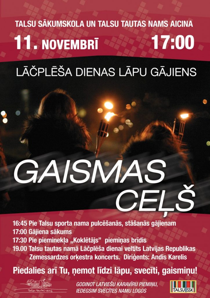 Sestdien, 11. novembrī, plkst. 17.00 Talsos notiks Lāčplēša dienai veltīts lāpu gājiens „Gaismas ceļš”.