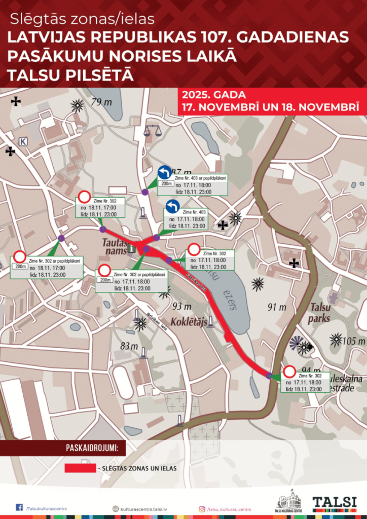 Slēgtās zonas/ielas Talsos 17. un 18.novembrī Latvijas Republikas 107.gadadienas pasākumu norises laikā